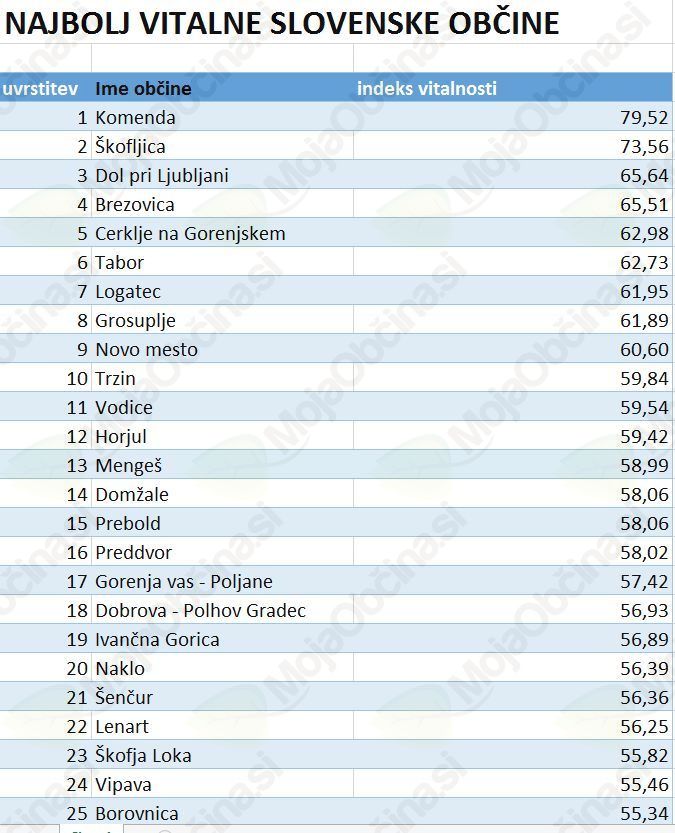 Zelo podobne kazalnike smo pripravili tudi za slovenske občine (večinoma so prav ti kazalniki že zajeti v sistemu ISSO). Sodeč po teh kazalnikih je najbolj vitalna slovenska občina Komenda.  Nobena druga občina v Sloveniji nima tako visoke rodnosti in tolikšnega deleža otrok. Tudi drugi demografski kazalniki so izjemno ugodni, prebivalstvo pa je med najbolj izobraženimi. Tudi število delovnih mest je močno nadpovprečno.
