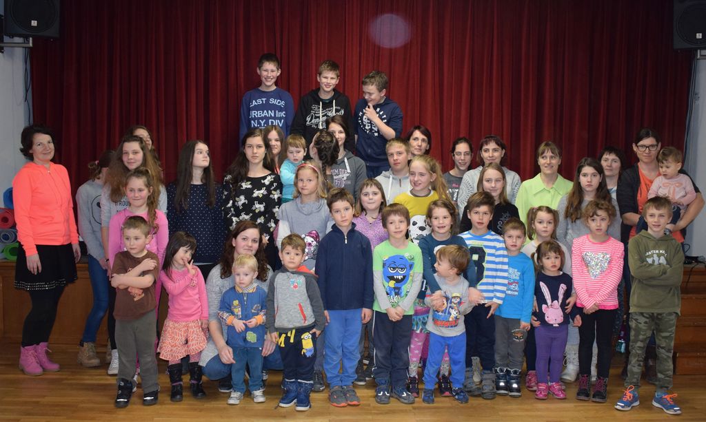 Začeli smo v tekmovalnem duhu, z zabavnimi igrami. Vse otroke in njihove animatorke smo razdelili v več skupin, ki so med seboj tekmovale. Prva igra je bila, Ugani, kaj se skriva v vreči? Nadaljevali so s kotaljenjem žoge med stožci, na loparjih za namizni tenis so prenašali plastične pokrovčke na drugo stran dvorane. Za bogatitev besednega zaklada so si izmišljali najrazličnejše besede na določeno črko. V tretjem delu pa so sledile igre na izpadanje – okameneli ptiči in gnilo jajce. Proti koncu je  naša Martina otroke še malo razveselila z glasbo. Ob spremljavi klavirja so peli otroške pesmice in zraven tudi zaplesali. Sledila ja nagrada. Ker so se vse skupine zelo potrudile, so si prav vsi, majhni in veliki, malo mlajši in malo starejši, pa tudi pridne animatorke ter seveda mamice, ki so pomagale pri igrah, zaslužili nagrado. Kakšno? Seveda – slastne palačinke z nutelo in banano. Zanje je poskrbel naš mladi pek Žan, ki sta mu pomagali kuhinjski pomočnici Andreja in Katja. Otroške jezičke pa smo zmočili s toplim čajem. Veseli smo, da Črni Vrh kot majhen kraj še vedno premore tako veliko število otrok, ki se radi udeležijo takšnih druženj, saj je v dvorani mrgolelo kot živo mravljišče.