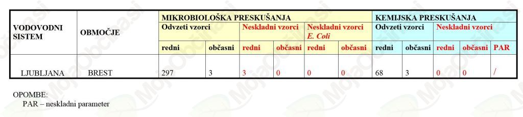 Skladno s Pravilnikom o pitni vodi (Ur. l. RS 19/04, 35/04, 26/06, 92/06, 25/09) smo pripravili letno poročilo o skladnosti pitne vode za leto 2013, ki je objavljeno na spletni strani www.vo-ka.si v rubriki Informacije/Kakšno vodo pijemo/Letno poročilo o skladnosti pitne vode. Povzetek poročila se nahaja v preglednici, ki prikazuje število odvzetih in neskladnih vzorcev v okviru notranjega nadzora za mikrobiološka in fizikalno-kemijska preizkušanja za oskrbovalno območje Brest.