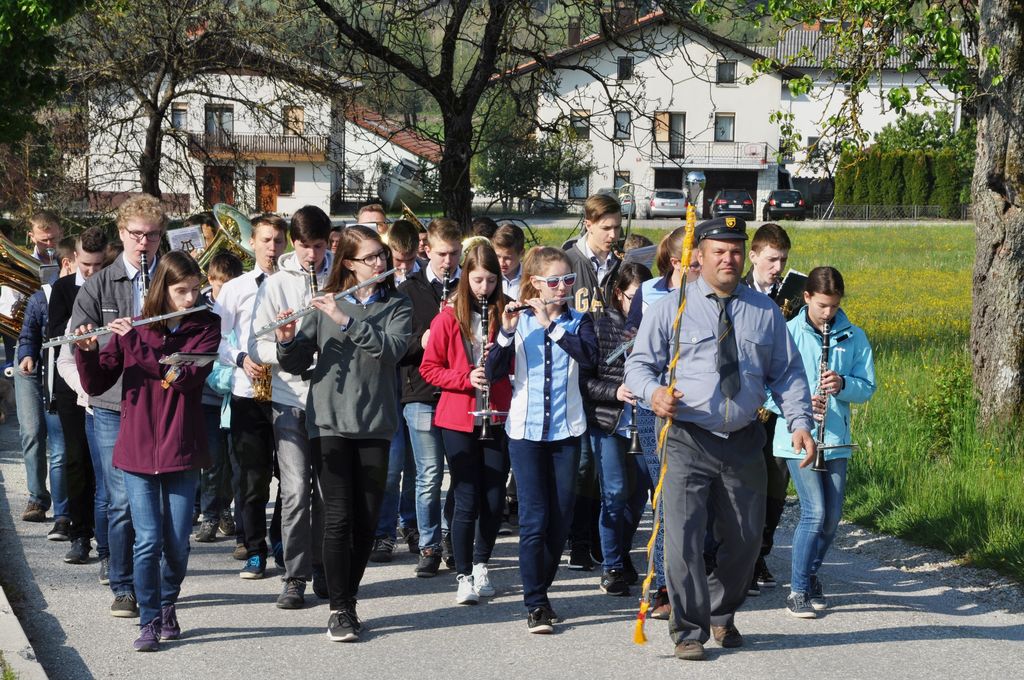 Župan Franc Setnikar je poskrbel za avtobus in šofer Vinko je njene člane pobiral na posameznih postajah po občini od Šentjošta navzdol in končno zadnje zbral v Podolnici. S prijetno a odločno in nič kaj zaspano glasbo ob korakanju skozi vas jim je ob 5.45 uspelo prebuditi tudi tiste, ki so preteklo noč pridno dolagali dračje na manjše ali večje pripravljene kresove. Pa niso bili nič nejevoljni. Prav prijazno so jih sprejeli in postregli z jutranjo kavo in zajtrkom. Dobro podprti so nadaljevali pot do Šentjošta. Tu je bil sprejem domačinov najštevilčnejši. Inštrumenti in njihovi lastniki ter prvomajski kapelnik Gregor Čuden so bili že dobro ogreti, čeprav so bile jutranje temperature še nizke, saj je sonce komaj lezlo izza okoliških hribov. Zatem pa v Polhov Gradec. Maloštevilni pa tisti toliko bolj zagreti navdušenci bodo novico o stalnem prvomajskem dogodku, ki ga ne gre zamuditi, zagotovo ponesli svojim sokrajanom. V Gabrju so godbeniki korakali in igrali od začetka vasi do Dleska, kjer je bilo tudi že nekoč vaško središče. Sprejem v domači vasi predsednika Godbe Dobrova-Polhov Gradec Boruta Dolinarja je bil še posebno topel. Na poti do Dobrove je avtobus napravil še nenačrtovan postanek na Šujici, kjer so godbeniki poskusili prebuditi prebivalce spalnega naselja. Pri tem niso bili najbolj uspešni, vendar bistvo je očem nevidno, zato bo godba prihodnje leto to postajo na ta dan zopet obiskala. Dan je postajal topel in prijeten, česar v teh dneh nismo bili več vajeni. Godbeniki so zdaj lahko odvrgli vrhnja oblačila in na Dobrovi, kjer se odvijajo njihove redne tedenske vaje, zakorakali v godbenih srajcah. Domači župnik je s peščico župljanov po maši godbo pričakal pri cerkvi. Pesem je zadonela, ravno tako pa tudi slovesna pozdrava svetemu Jožefu in župniku Lojzetu. Popotovanje se je zaključilo na Komaniji pod Adam'čevim kozolcem. Tam se je igralo, plesalo, pilo in dobro jedlo. Za slednje se gre zahvaliti družini Jarc, iz katere izhaja tolkalist Urh, in podjetju Jane d.o.o., mecenu Godbe Dobrova-Polhov Gradec, ki godbo ob tem dogodku vsakoletno povabi v goste. Hudomušni kapelnik se je za sprejem zahvalil in zopet obljubil, da se ob letu osorej tam spet oglasijo v tej sestavi, pa če bodo gostujoči to hoteli ali pa ne. Najbolj vztrajni so tam v veseli družbi počakali, da so starši prišli po svoje mlade godbenike in da se je dopoldan počasi prevesil v večer 1. maja 2017. leta Gospodovega.
