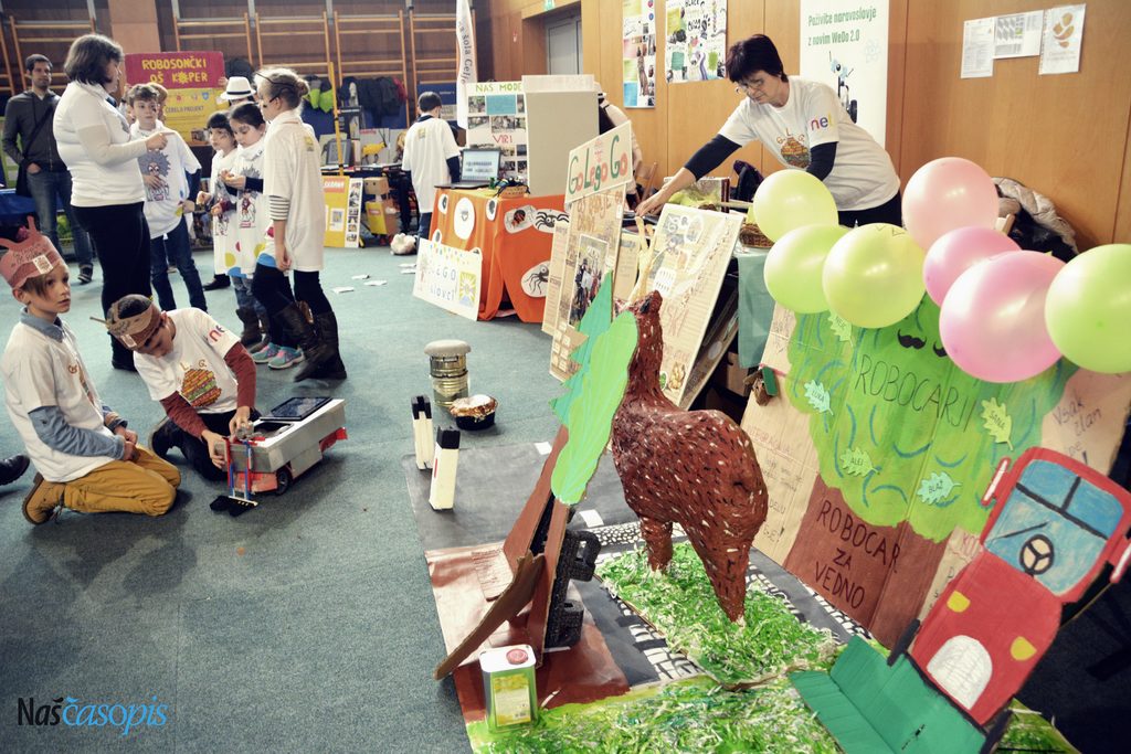 Nekoliko stran od vrveža, ob obodu dvorane, so se predstavljale ekipe s svojimi raziskovalnimi nalogami, v okviru katerih so poskušale s pomočjo Lego kock rešiti praktične probleme vsakdana – nanašajoč se na živalsko tematiko. Edina ekipa z območja Našega časopisa, ki se ji je uspelo prebiti v finale, je bila ekipa OŠ Dobrova, imenovana Mindstormsi z mentorjem Izidorjem Ličerjem: »Pripravili smo samohranilni stroj za domače živali. Namreč, v času ko ni lastnika doma, jim nihče ne more dajati hrane. Zato smo razvili model, ko žival s pritiskom na gumb sama dozira hrano.« Ličer je dodal, da so stroj testirali celo v živalskem vrtu na Vrzdencu in pri enem članu ekipe doma. Srce dozirnika so sestavili iz Lego kock, okrog pa dodali ohišje iz drugih materialov: »Naša skupina ima pet članov in vsi komaj čakajo, da se enkrat tedensko snidemo na krožku. Tovrstno raziskovanje jim predstavlja velikanski užitek.« A Ličerjeva ekipa ni bila edina z Dobrove, tu so bili še Super junaki, stari od 6 do 10 let, ki pa so se predstavljali z nekoliko manj zahtevnimi projekti. A ne glede na zahtevnost so ravno oni imeli čast prvi predstaviti predsedniku države svoj Lego projekt!