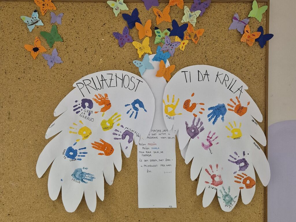 V OPB1 so učenci skozi zgodbe, pogovore in igre spoznavali, kako lahko z drobnimi dejanji polepšamo dan drugim in sebi. Na razrednem plakatu »Prijaznost ti da krila« je vsak odtisnil svojo dlan in s pomočjo učiteljice zapisal, kaj zanj pomeni prijaznost. Vsak učenec je izdelal tudi svojega metulja in na krila narisal risbico. Metulji so poleteli nad razrednim plakatom, ki krasi naš hodnik in nas vsak dan spominja, da prijaznost nima meja – kot krila, ki nas lahko dvignejo visoko.