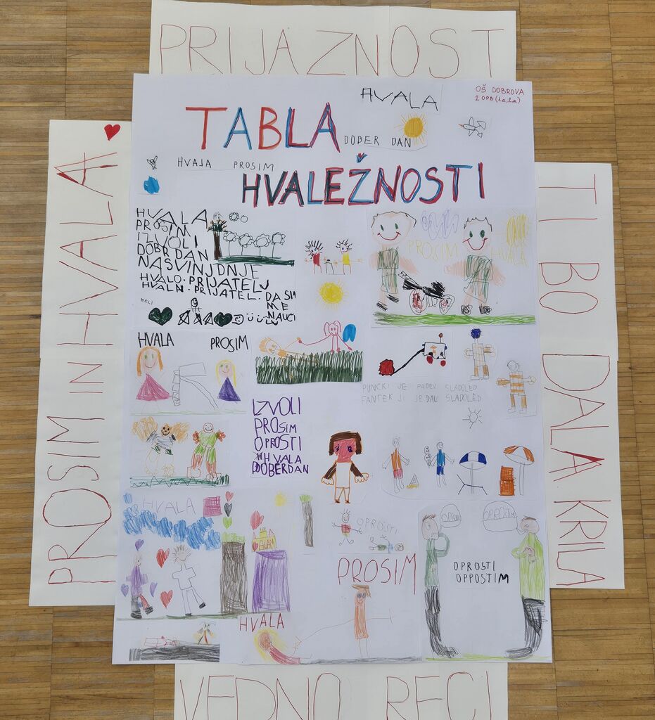 V OPB2 so učenci narisali različne primere medsebojne pomoči in uporabo lepih besed na šolskem igrišču, v razredu ter drugod. Poudarili so pomen opravičila, medsebojne vzpodbude in pomoči pri učenju. Plakat so obrobili z letošnjim sloganom projekta, ki se glasi Prijaznost, ti bo krila dala, vedno reci prosim in hvala.