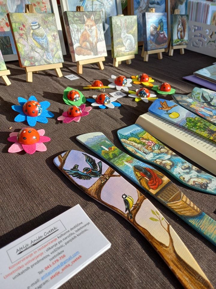 Izdelki v ponudbi: umetniške slike, unikatni predmeti, voščilnice, ročno poslikane panjske končnice …