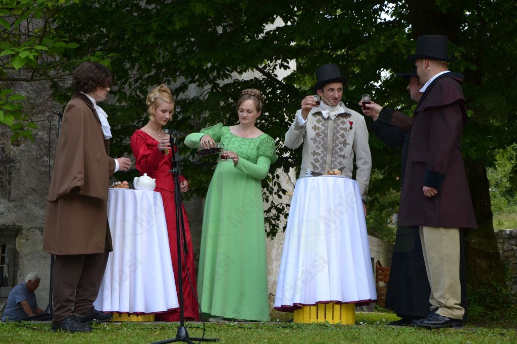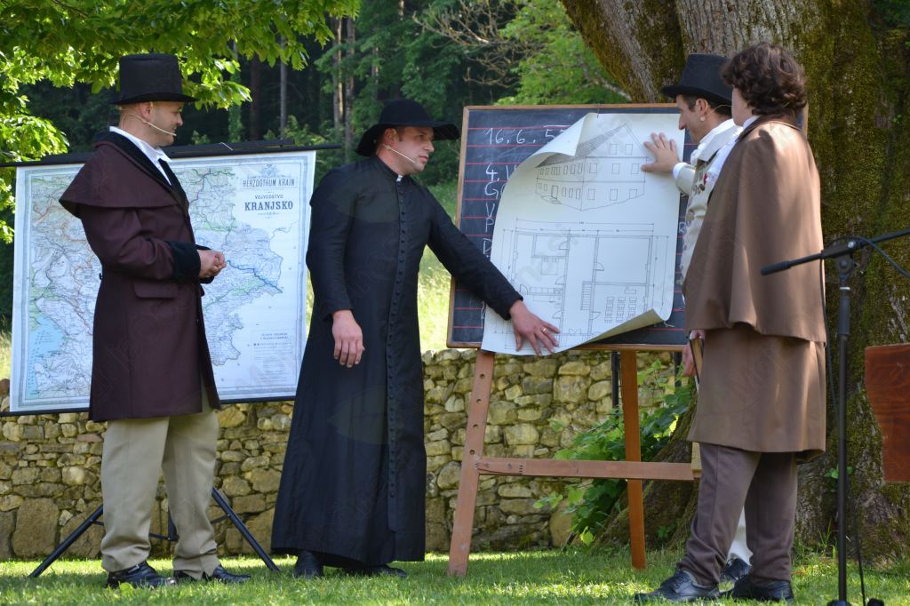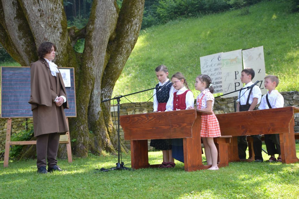 Sonce je pripekalo tudi tokrat in lepa množica obiskovalcev, ki si je prišla ogledat igro iz časa življenja grofa Blagaja, je v grajskem parku iskala zavetje v senci. Kot naročeno je Dramska skupina Neptun prizorišče postavila pod grajsko lipo. Tod so prikazali, kako je pouk v Polhovem Gradcu potekal takrat, ko so otroci učno uro vedno začenjali z molitvijo, ko je bil odnos učencev do učitelja zelo spoštljiv in se je njihov stavek vedno začel oziroma končal z "gospod učenik", takrat, ko so še pisali s kredo na tablice, ko so pri številstvu seštevali in odštevali goldinarje in krajcarje, ko so bili pobiranje krompirja, rojstvo telička ali pa pobeg koze krivi za izostanek od pouka. Prisrčen je bil prikaz otrok in zelo pristen je bil nato obisk nadučitelja, župnika in grofa Blagaja z namenom, da učenika seznanijo z novim projektom, za katerega si je grof Blagaj močno prizadeval. Želel je zgraditi nov skupni dom, dom omike in kulture, ki bi služil za potrebe šole in hkrati mežnarije. Kasneje se jim je pridružil še nežnejši spol in skupaj so nazdravili začrtanim idejam ter se s sprevodom, ki so ga sestavljali konjeniki iz Horjula, vprega z dvema osličkoma iz Škofje Loke, zapravljivček iz Horjula, konjska vprega iz Sostrega pri Ljubljani, Folklorna skupina Grof Blagaj iz Polhovega Gradca ter otroška folklorna skupina Nagajivčki, odpravili na sejem. Tam so, kdo ve, morda že našli kak primeren kos pohištva, če ne tega, pa prav gotovo primernega pujsa za zakol in zimske zaloge.