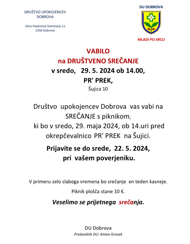Društvo upokojencev Dobrova vas vabi na srečanje s piknikom, ki bo v sredo, 29. maja 2024, ob 14. uri pred okrepčevalnico Pr' Prek na Šujici. Prijavite se do srede, 22. 5. 2024, pri vašem poverjeniku. V primeru zelo slabega vremena bo srečanje en teden kasneje. Piknik plošča stane 10 €.