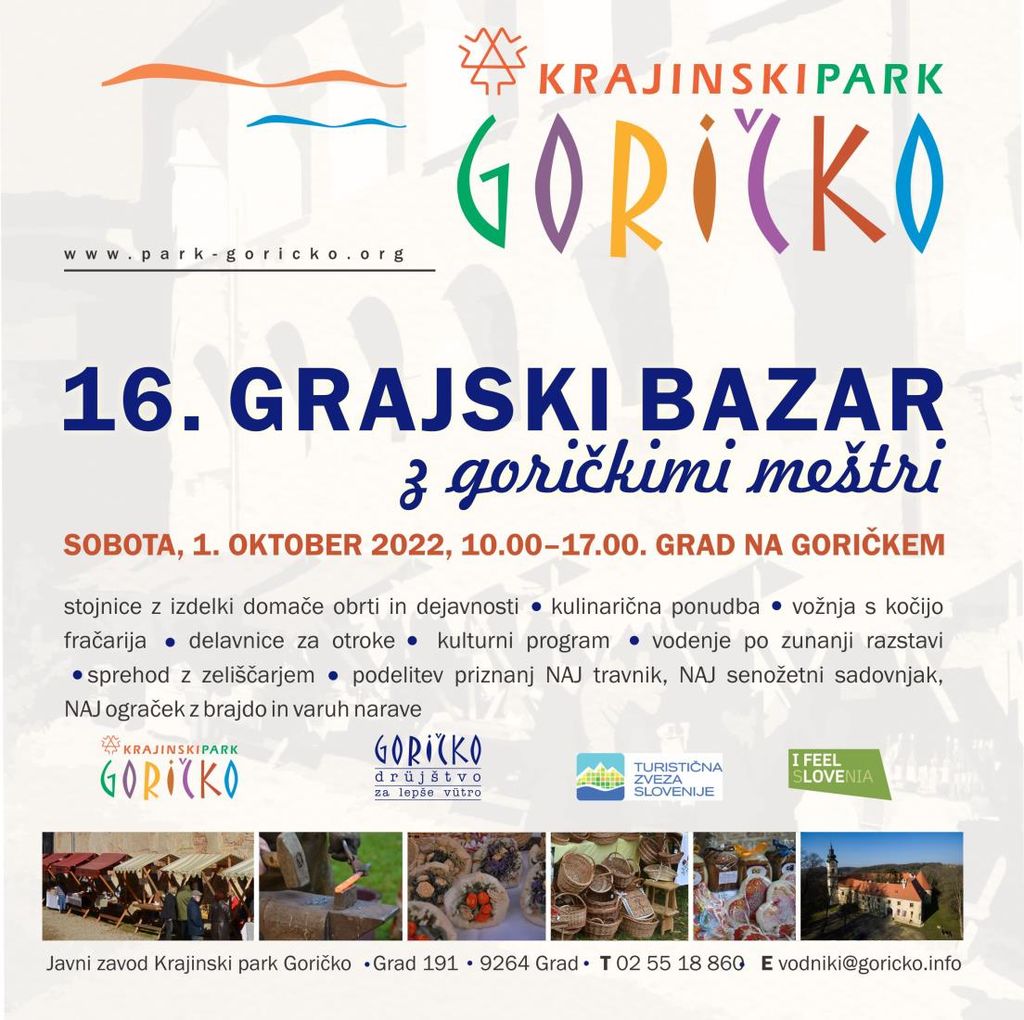Javni zavod Krajinski park Goričko v sodelovanju z Goričkim drüjštvom za lepše vütro organizira v soboto, 1. oktobra 2022, med 10.00 in 17.00 16. GRAJSKI BAZAR Z GORIČKIMI MEŠTRI na gradu Grad.
