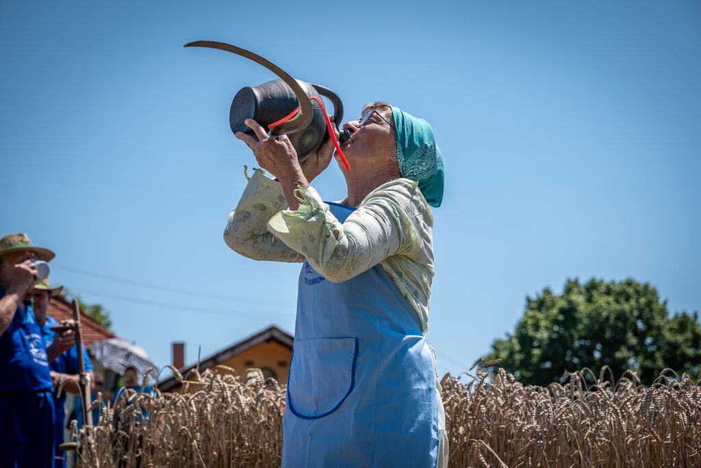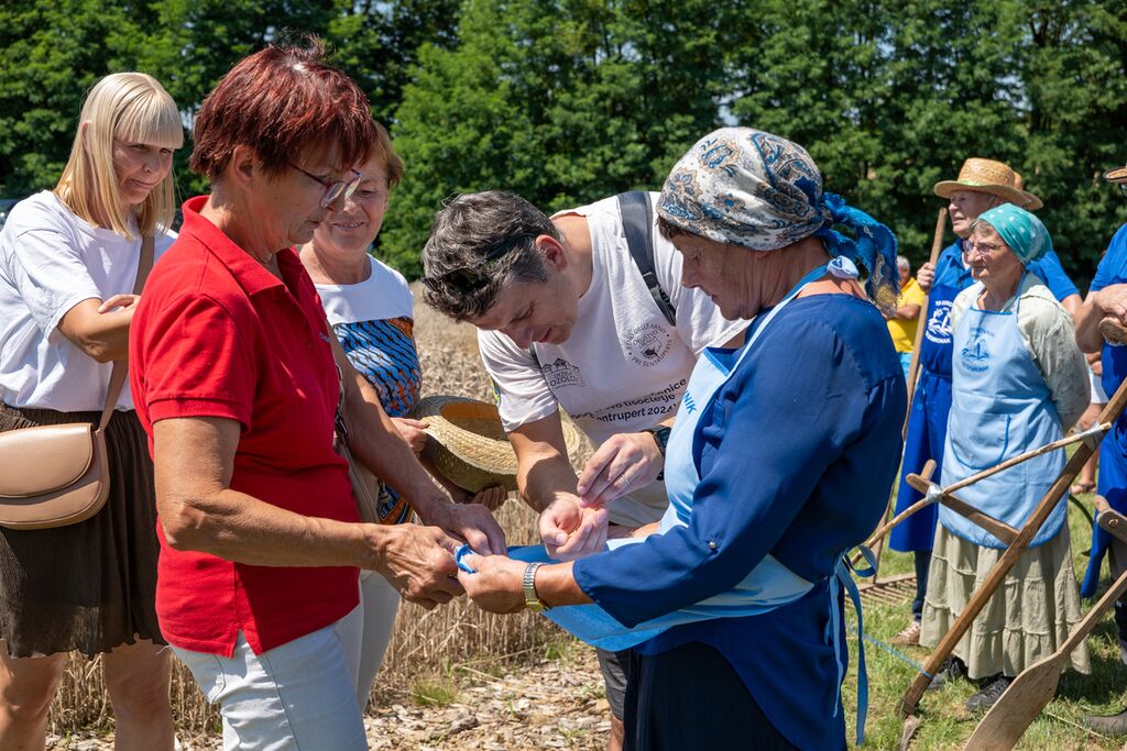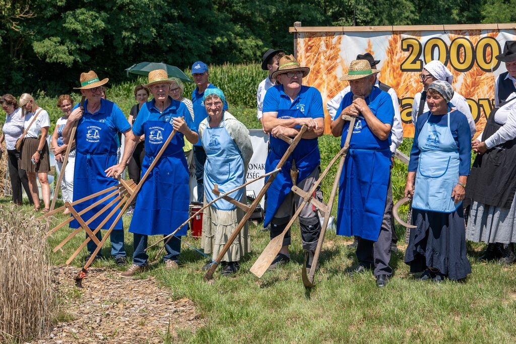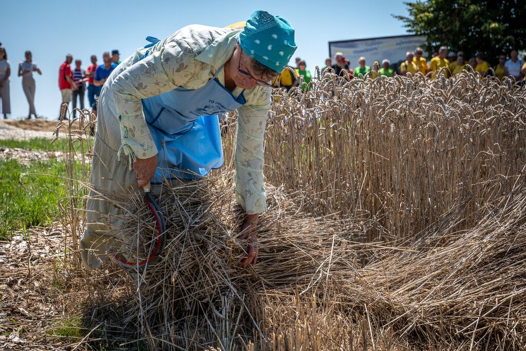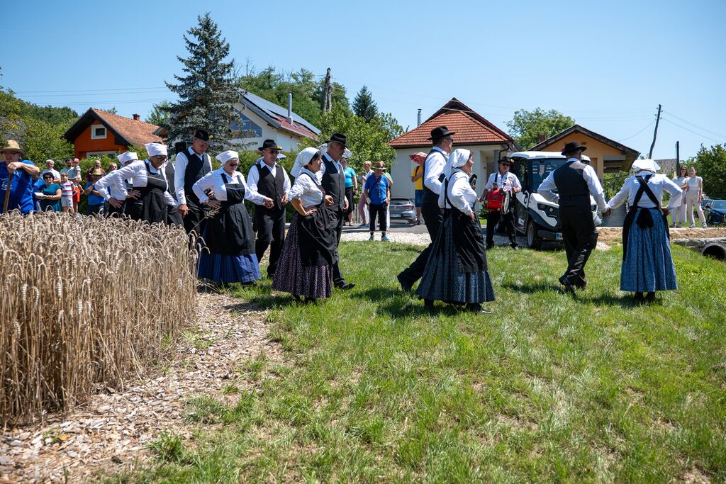 Ezután kisvonatozás következett a learatandó tábla helyszínéig, amely sok résztvevő számára különleges élményt nyújtott. A látogatók ezt követően részt vettek az arany kalászok kézi aratásában – ahogy azt elődeink egykor végezték. Az aratás kezdete előtt a szakértői bizottság kiválasztotta a legnagyobb és legszebb búzakalászt, amelyben 76 búzaszemet számoltak meg – ez az eddigi rekord.