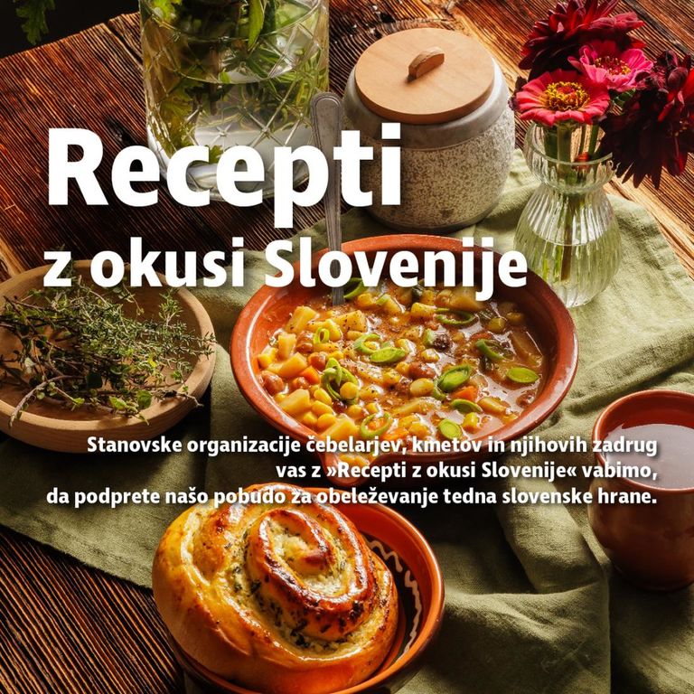 Z željo spodbuditi odgovorno prehransko verigo od njive do krožnika so stanovske organizacije čebelarjev, kmetov in njihovih zadrug pred letom dni, 16. 11. 2022, na Vlado Republike Slovenije naslovile pobudo, da dan slovenske hrane preraste v teden slovenske hrane. V tednu, ko obeležujemo dan slovenske hrane (13.−19. november 2023), vas z »Recepti z okusi Slovenije« spodbujajo, da tradicionalne slovenske jedi iz lokalnih sestavin s ponosom umestite v osrčje jedilnikov.