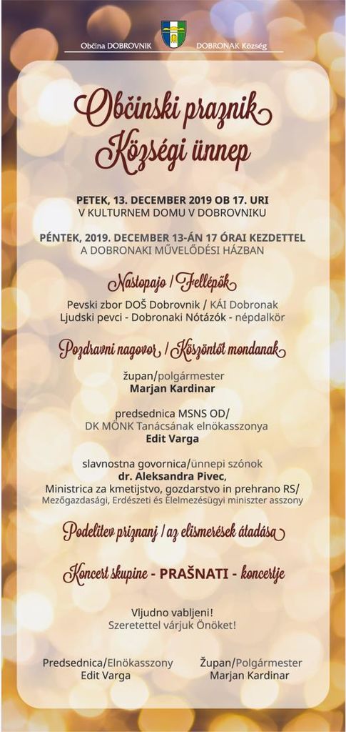 Vljudno vabljeni na obeležitev Občinskega praznika Občine Dobrovnik, ki bo ta petek, 13.12.2019, ob 17. uri v Kulturnem domu v Dobrovniku. Več informacij najdete na plakatu.