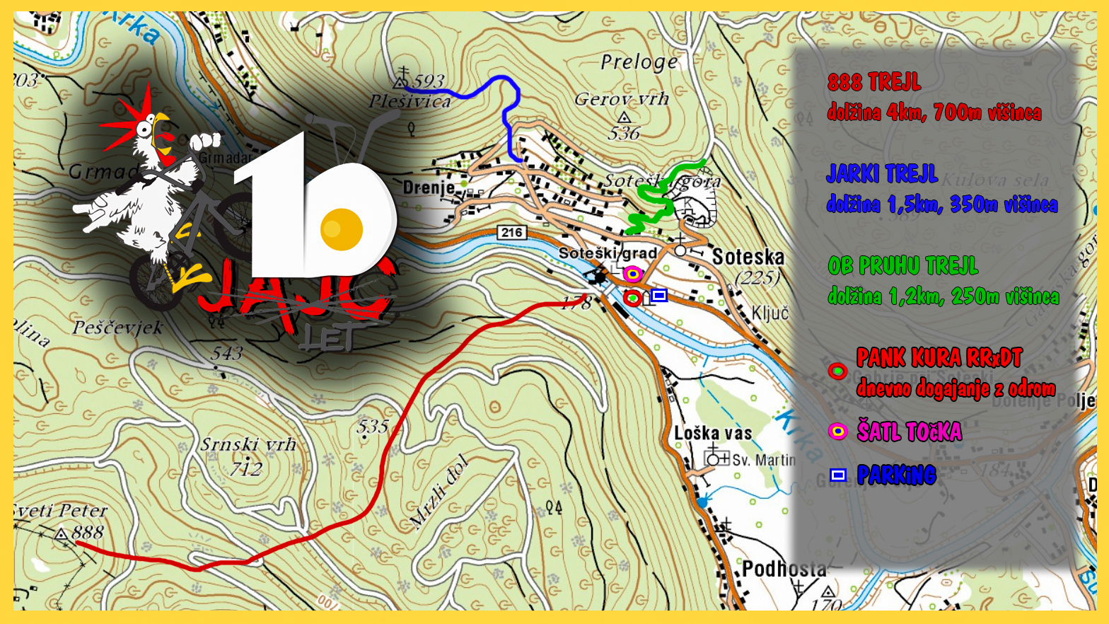 V soboto in nedeljo Vas že od jutra dalje šatlamo na trejle nad Sotesko. Pri Hudičevemu turnu na Velikemu vrtu, pa bo že čez dan poskrbljeno za počitek ter nabiranje moči ob glasbi, hrani (jajc ne bo manjkalo) in pijači. V soboto zvečer pa Pank Kura časti koncerte glasbenih skupin Stara Šula, LUTO in Captain Morgan's Revenge.