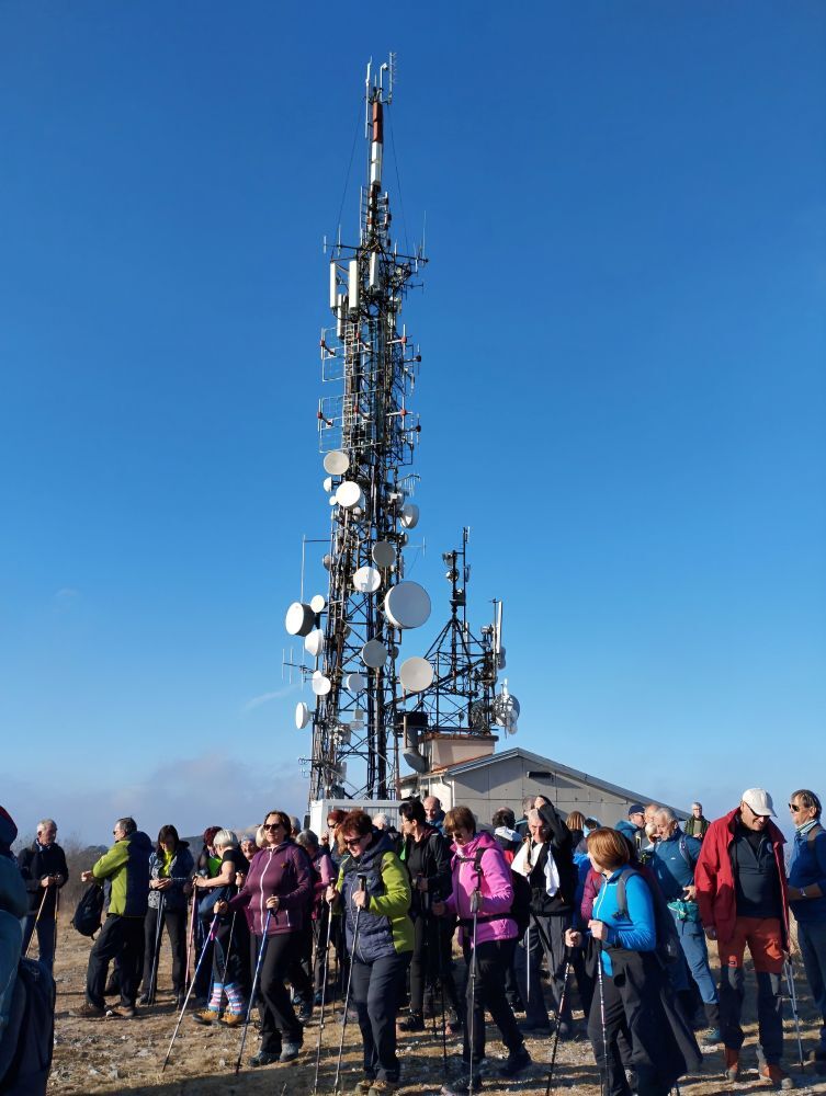 Naš cilj je bi najvišji hrib na slovenskem Krasu, hkrati najvišji vrh Črnih hribov, ki se dvigujejo nad planoto Tržaško-Komenskega Krasa med Lipo in Opatjim selom ter padajo proti Vipavski dolini med Dornberkom in Mirnom. Avtobus nas je odložil v Lipi, pri Lebanovih. Kolona se je odpravila proti cerkvi sv. Mihaela pri kateri se začne označena pot. Pot se strmo dviga med grmičevjem, po borovem gozdu, delno po makadamu do Stjenkove koče, nato do razglednega vrha, kjer so oddajniki. Pogledi na Julijske Alpe, Nanos, Vipavsko dolino so bili čudoviti. Le morja nismo videli. Leta 2022 je tudi ta predel prizadel največji požar v zgodovini Slovenije. Od takrat je bilo 35 akcij in obnovljenih precej hektarjev pogorišča. Tudi letos v novembru je bila vseslovenska akcija sajenja dreves, tudi poizkusni postopek sajenja sadik z mikoriznimi glivami, ki posnema naravno sožitje med glivami in Krasom.