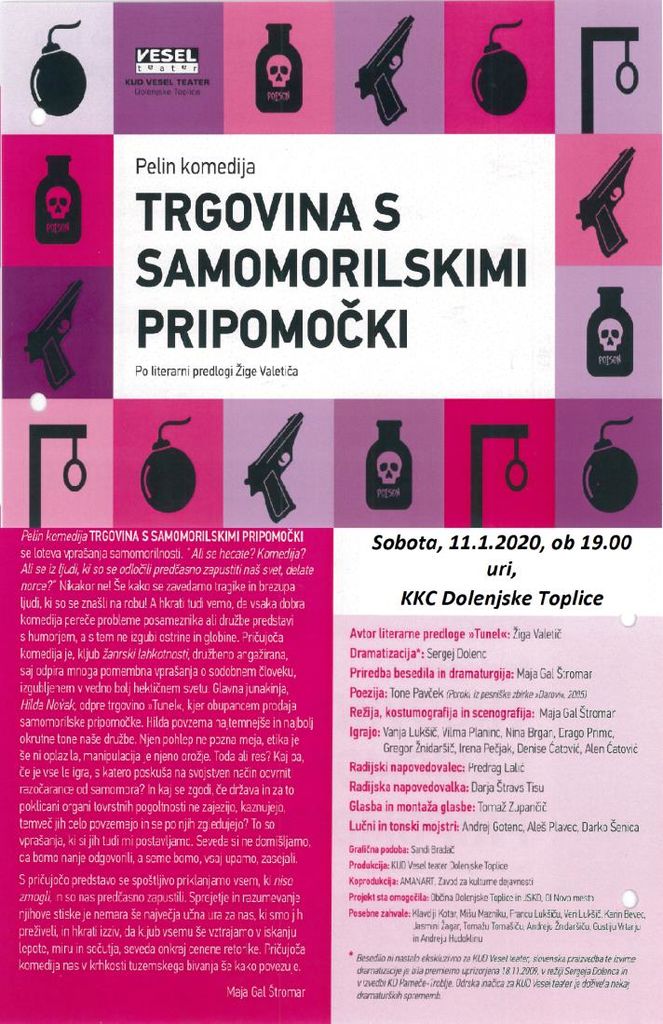 Za predstavo Trgovina s samomorilskimi pripomočki, ki se odvija 11. januarja 2020, ob 19. uri, v veliki dvorani KKC Dolenjske Toplice, si je treba zagotoviti vstopnico.