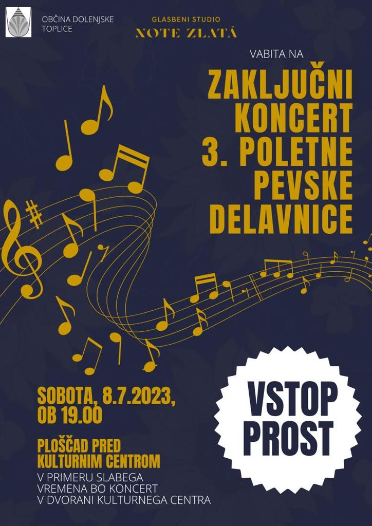 srčno vabljeni na zaključni koncert udeležencev 3. poletne pevske delavnice v soorganizaciji občine Dolenjske Toplice in Glasbenega studia Note zlatá, pod mentorstvom pevke, violinistke in pedagoginje Maje Bevc, ki bo v soboto, 8.7.2023, s pričetkom ob 19. uri.