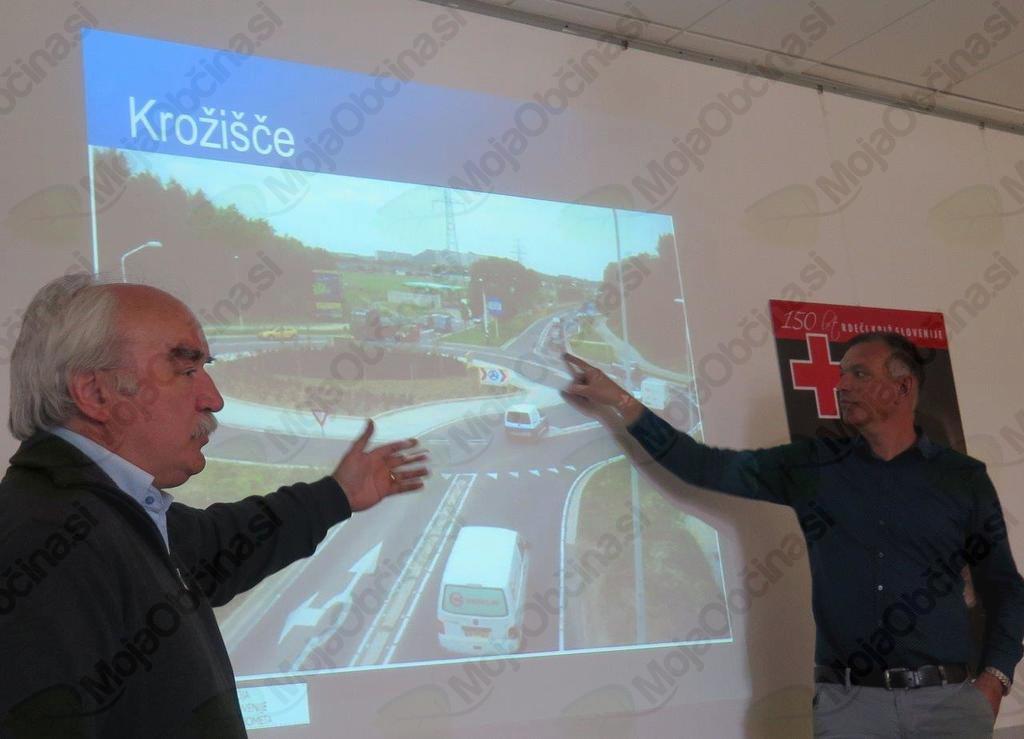 prometa: Niko Mihellič in Bojan Jakše. Razlagala sta sheme krožišč, tudi "tabletke" in turbo krožišča, in konkretizirala dejanske lokacije na področju Novega mesta.
