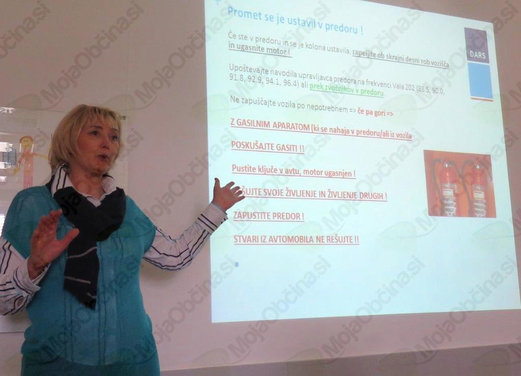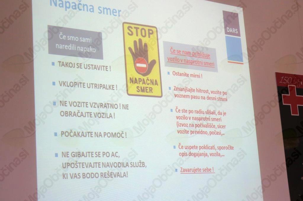 Nataša Kovše, predstavnica DARS-a je predočila vožnjo po avtocesti s poudarkom, kako ravnamo, ko se zavemo, da vozimo v napačno smer, pa tudi, ko pride do ovir v predoru in do zastojev.