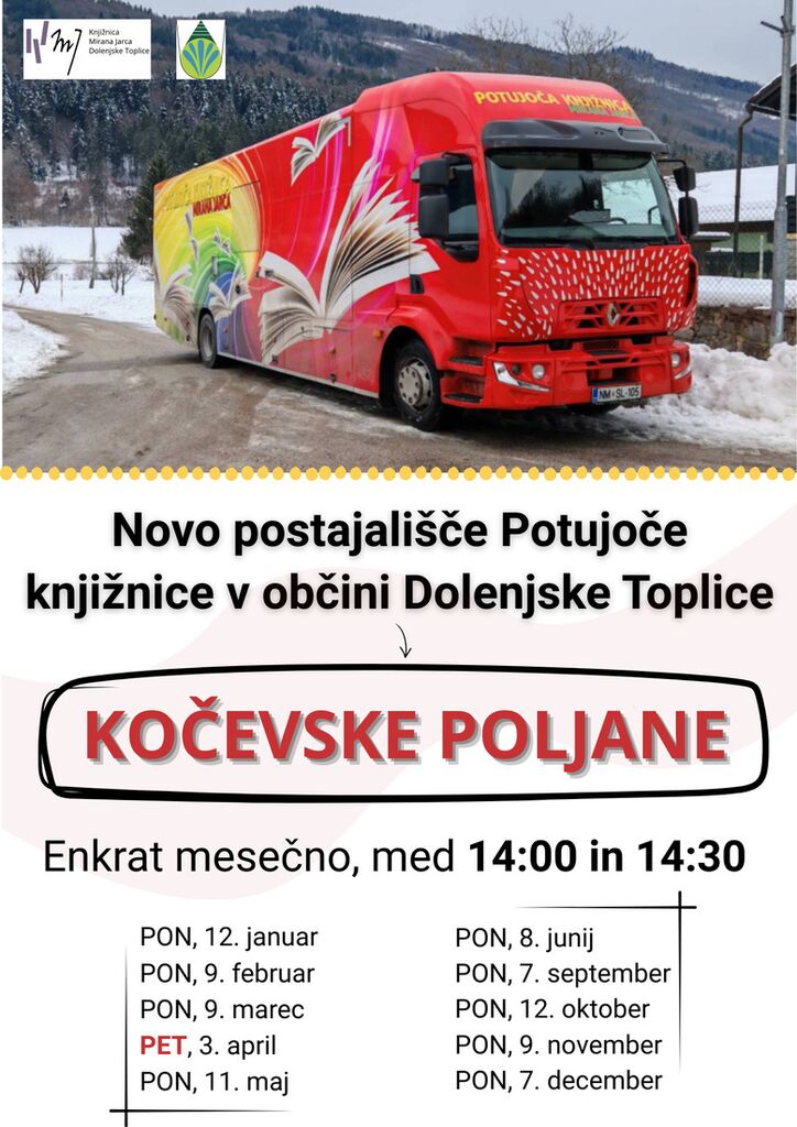 Potujoča knjižnica ima novo postajališče v občini Dolenjske Toplice Kočevske Poljane. Postanek bo enkrat mesečno, vedno med 14.00 in 14.30, po objavljenem letnem urniku. Vabljeni, da si izberete novo branje kar v potujoči knjižnici!