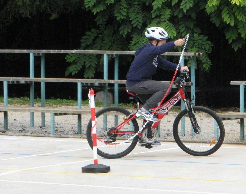 Potem smo nekateri učenci učitelju pomagali postaviti poligon. Bil je zelo zanimiv. Nekatere vaje so bile zelo težke. Meni je bilo najtežje, ko smo morali zavijati mimo stožcev. V drugem poskusu mi je uspelo narediti vajo zavijanje mimo stožcev. Malo težje je bilo loviti ravnotežje. Druge vaje so bile nekoliko lažje.