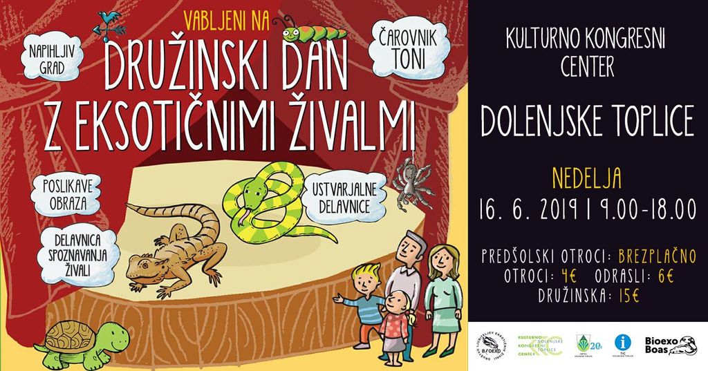 Vabljeni v Kulturno kongresni center Dolenjske toplice v nedeljo, 16. junija, od 9. do 18. ure, kjer bo potekal družinski dan z eksotičnimi živalmi.