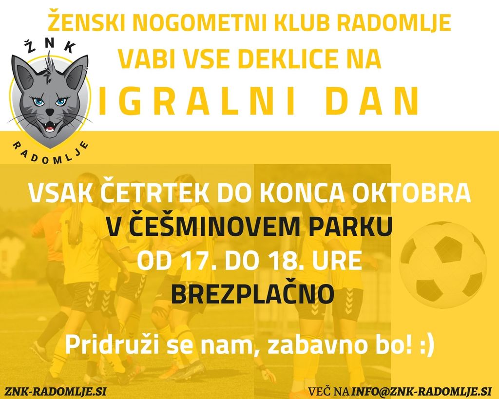 Ženski nogometni klub Radomlje organizira igralni dan za vsa dekleta, ki bi se rada spoznala z nogometnimi veščinami.
