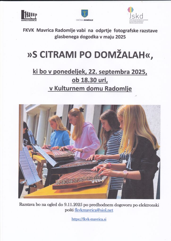 V maju mesecu letos je v Domžlah potekal vseslovenski festival citer z naslovom "S CITRAMI PO DOMŽALAH", ki ga je fotografsko pospremilo naše društvo - FKVK Mavrica. Izbor fotografij smo skupaj z JSKD opravili in pripravili fotografsko razstavo, na katero vas prijazno vabimo v Kulturni dom Radomlje.