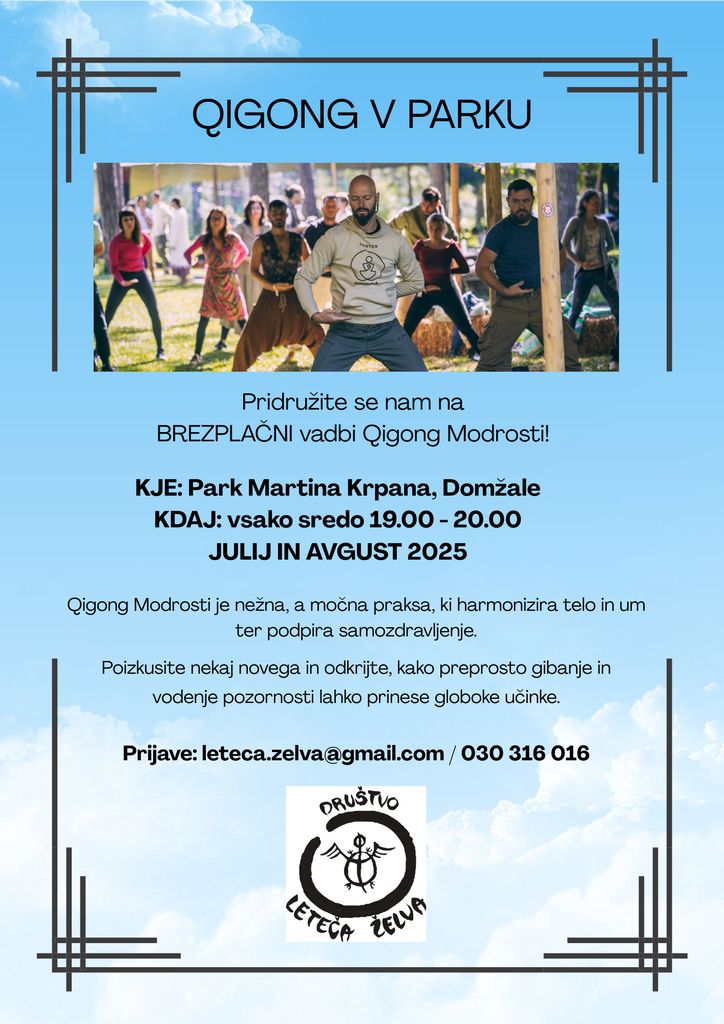 Vsako leto po zaključku rednih vadb v Studiju Ritual, nadaljujemo z brezplačno vadbo Qigong Modrosti v parku. Namen je izmenjava znanja in možnostjo spoznavanja praks, ki podpirajo regeneracijo in sproščanje.