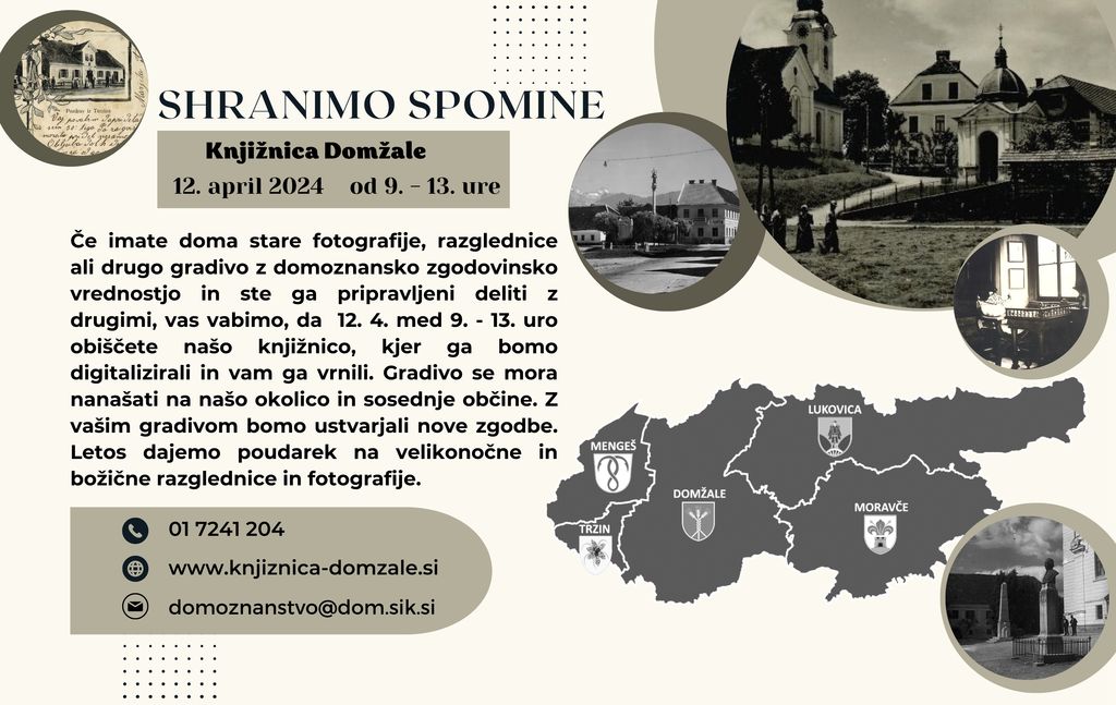 V Knjižnici Domžale drugo leto zapored pripravljamo dogodek z naslovom Shranimo spomine. Dogodek je namenjen prebivalcem občin Domžale, Mengeš, Moravče, Trzin in Lukovica. Lepo vabljeni vsi, ki bi bili pripravljeni deliti vaše stare fotografije, dokumente, pisma ali drugo gradivo z domoznansko zgodovinsko vrednostjo (stare razglednice, fotografije tovarn in obrti, gradnja stavb, zime nekoč, stare božične in velikonočne razglednice, stari avtomobili, lokalna zgodovina in podobne vsebine, posnete v preteklosti), da ga prinesete v Knjižnico Domžale, kjer ga bomo na ta dan digitalizirali in vam originale vrnili. Naknadno vam lahko pošljemo gradivo tudi v digitalni obliki, da se bo ohranilo. Iz gradiva, ki ga bomo prejeli bomo ustvarjali nove digitalne zgodbe.