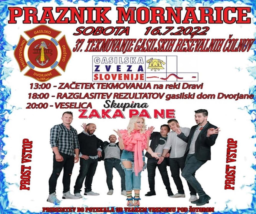 V nadaljevanju sobotnega praznika mornarice pa bo organizirana veselica z ansamblom ZAKA PA NE s pričetkom ob 20. uri, prav tako v šotoru pred gasilskim domom Dvorjane.