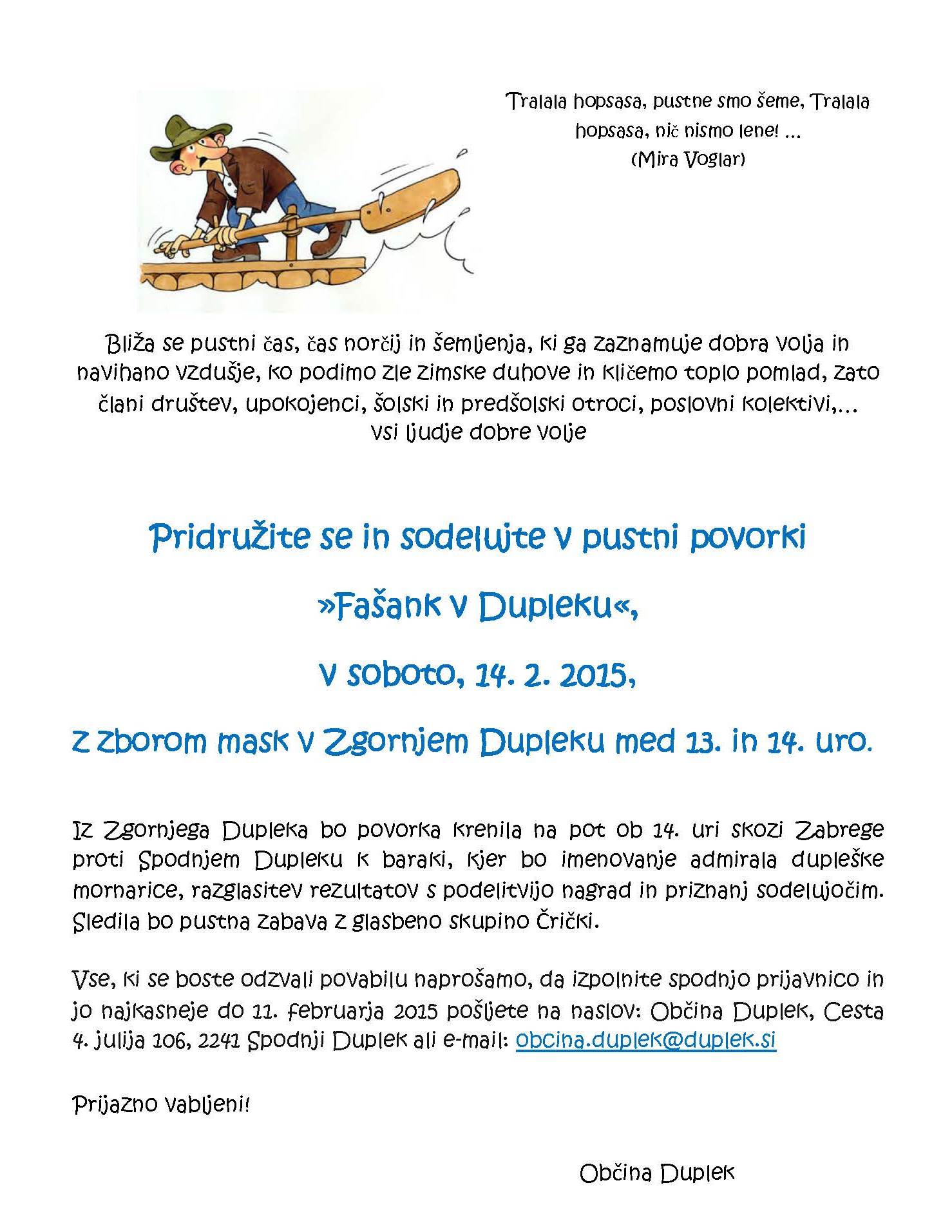 Pridružite se in sodelujte v pustni povorki v Dupleku, ki bo v soboto, 14. 2. 2015