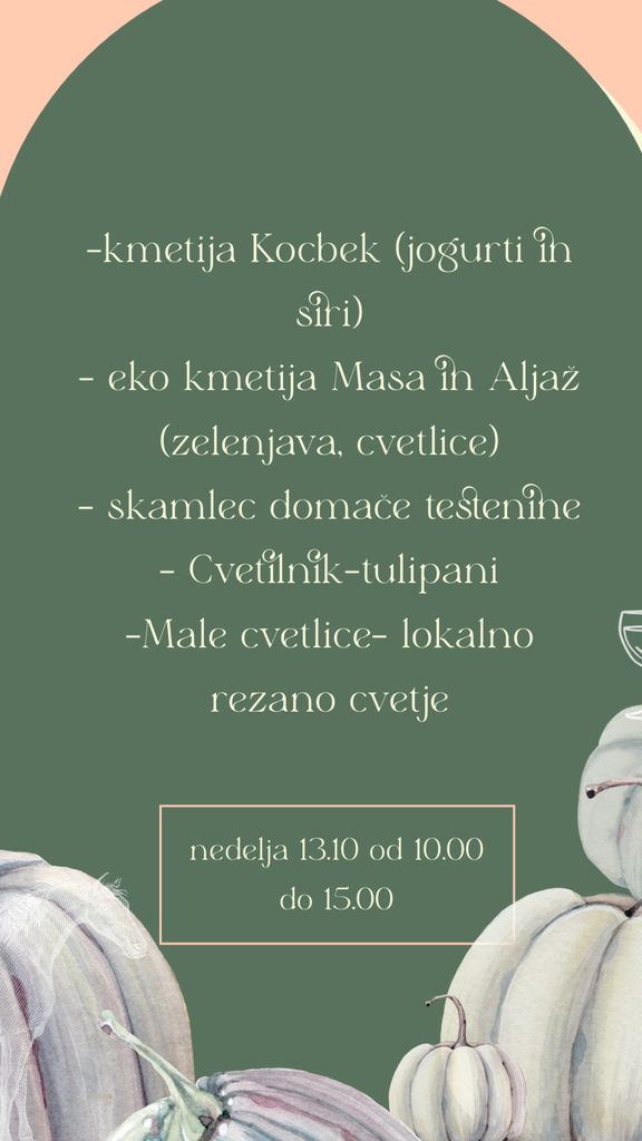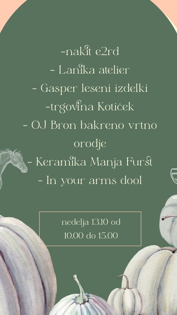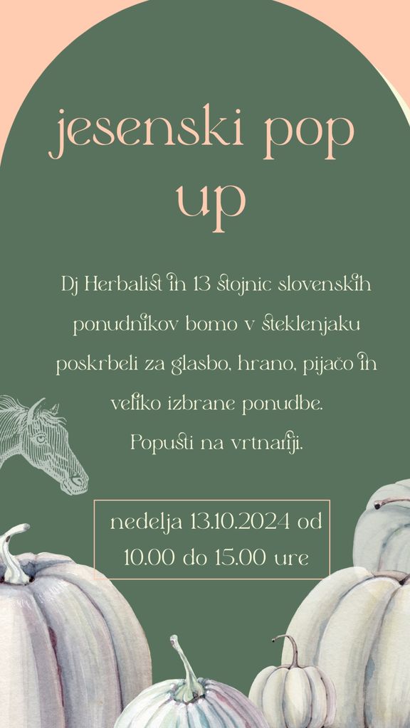 13 slovenskih ponudnikov slaščic, mlečnih izdelkov, bakrenega orodja, otroških oblačil, bio zelebjave, testenin, nakita... bomo skupaj v steklenjaku iživali v glasbi Dj Herbalista, hrani gostilne Valerija.