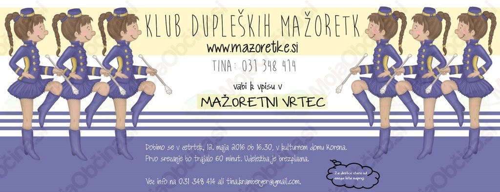 Vpis v MAŽORETNI VRTEC bo v četrtek, 12. maja 2016, ob 16.30 v kulturnem domu Korena. Prvo srečanje bo trajalo 60 minut. Udeležba je brezplačna.