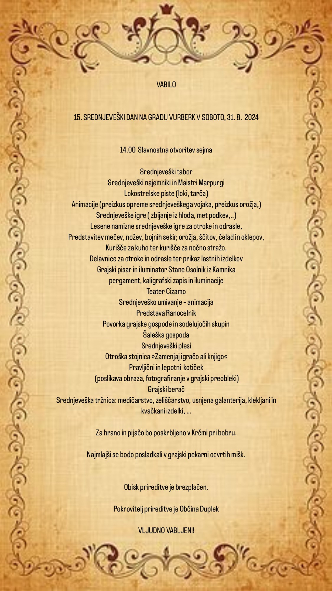15. SREDNJEVEŠKI DAN NA GRADU VURBERK V SOBOTO, 31. 8. 2024