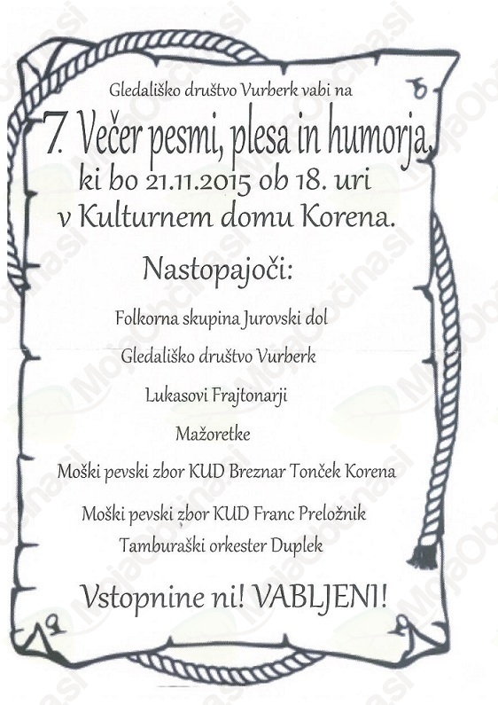 Gledališko društvo Vurberk vabi na 7. večer pesmi, plesa in humorja, ki bo 21.11.2015 ob 18. uri v Kulturnem domu Korena.