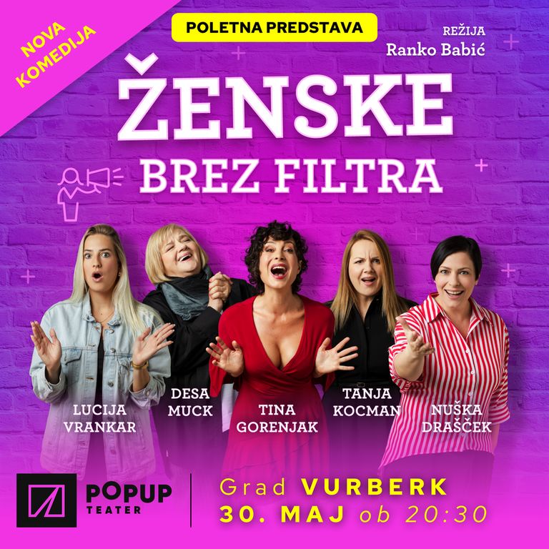 Vsaka od teh 5 žensk prinaša svojo zgodbo in izkušnje, vse pa združuje nefiltriran pogled na današnji svet, ki je pogosto prekrit s filtri. Na odru vas bo teh 5 žensk s vpogledom v svoje življenje in razmišljanje zagotovo nasmejalo do solz, filtre pa bodo prihranile za Instagram.