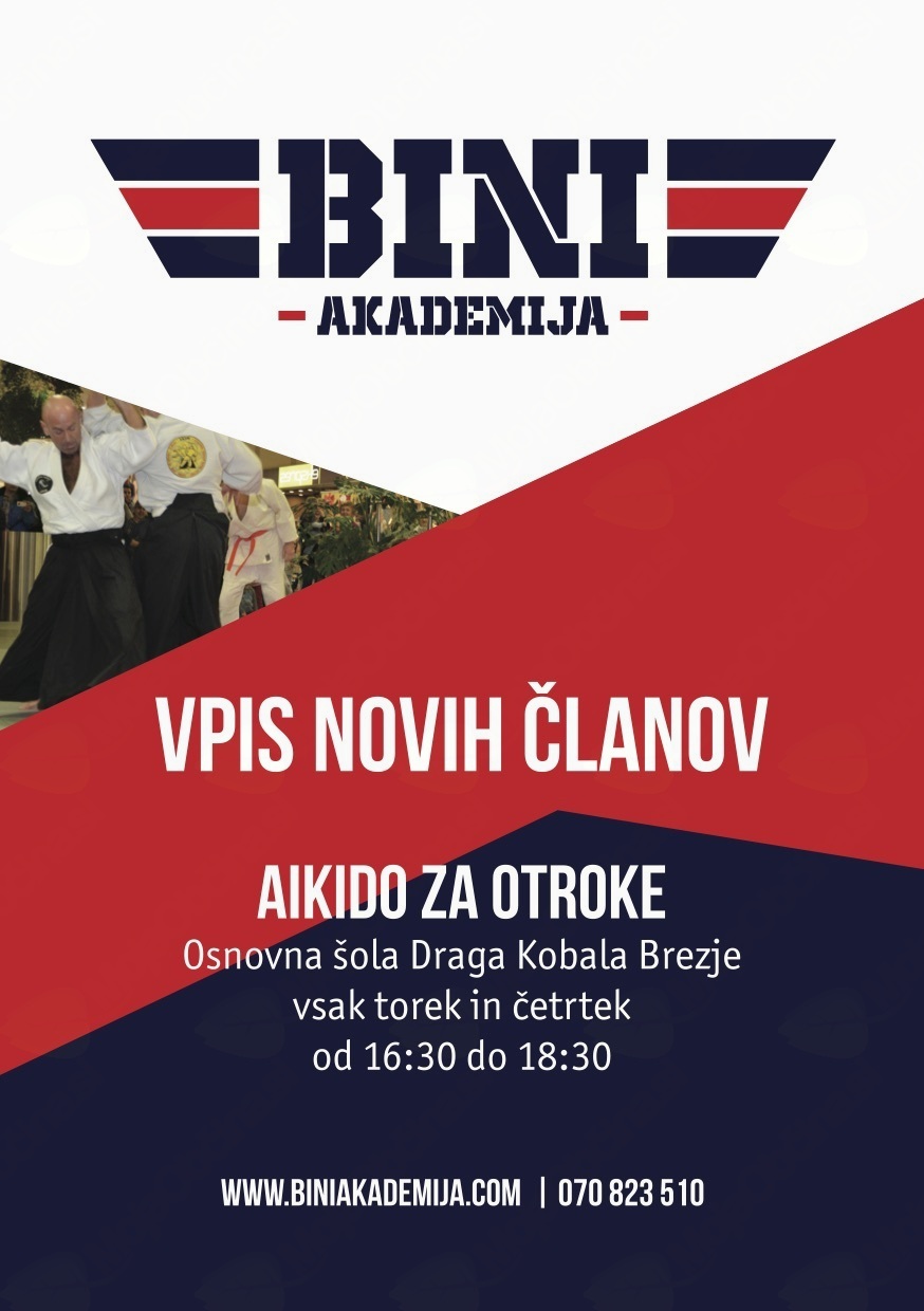 Mala šola aikida za otroke te vabi da se nam pridružiš na redne treninge Aikida za otroke od 3-7 in od 7-14 leta starosti.Pridi in poskusi na prvi brezplačni trening.Bodi delček naše akademije in treniraj skupaj z nami vsak torek in četrtek.Vse informacije www.biniakademija.com ali 070 823510 Bine
