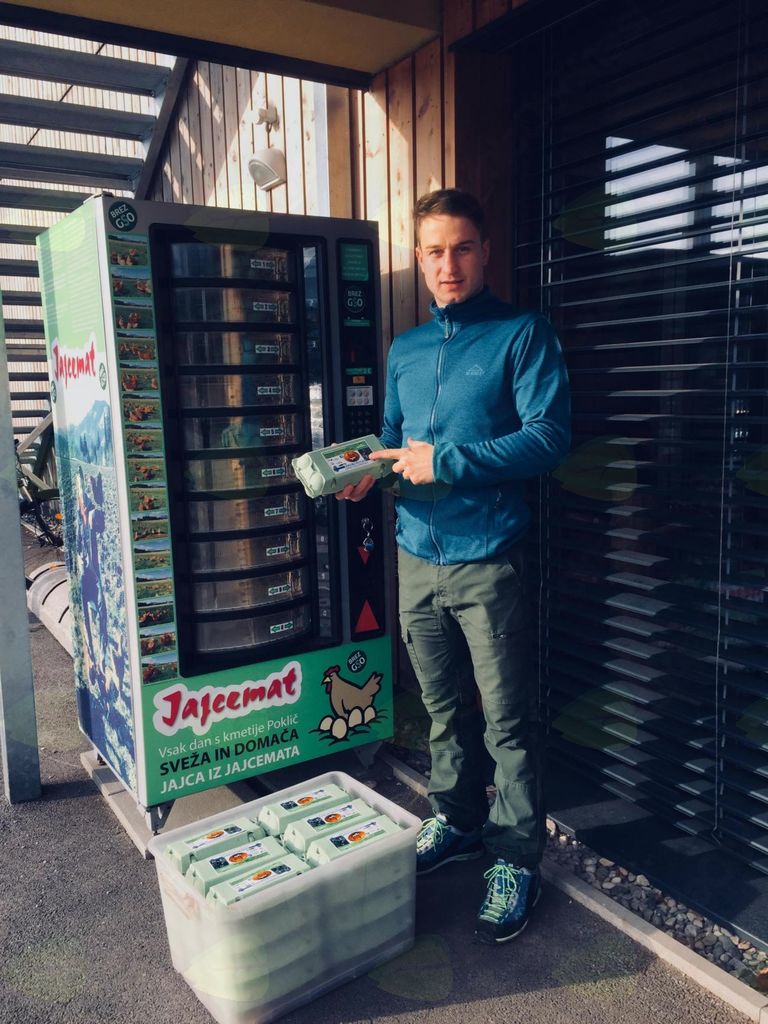 Kot smo že pisali, se na Koroškem v zadnjih letih dogaja prava revolucijo ponudbe domačih izdelkov iz avtomatov. Eno izmed zadnjih dobrih idej je uresničil Slovenjgradčan Franci Poklič. Sicer vulkanizer (dejavnost je prevzel od očeta, ki je imel 15 let vulkanizersko delavnico) se je pred nekaj leti začel ljubiteljsko ukvarjati tudi s kokošmi nesnicami. Začel je s 50 kokošmi, zdaj jih ima več kot 250, ki znesejo okoli 200 jajc dnevno.