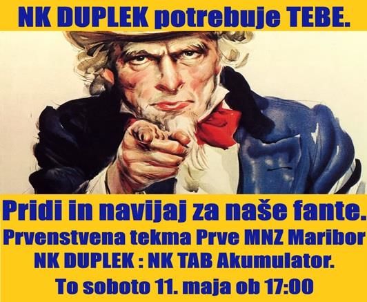 Vljudno vabljeni na tekmo NK DUPLEK : NK TAB Akumulator (Mežica),ki bo to soboto 11. maja ob 17:00, na igrišču ob OŠ Duplek. Za hrano in pijačo poskrbljeno.