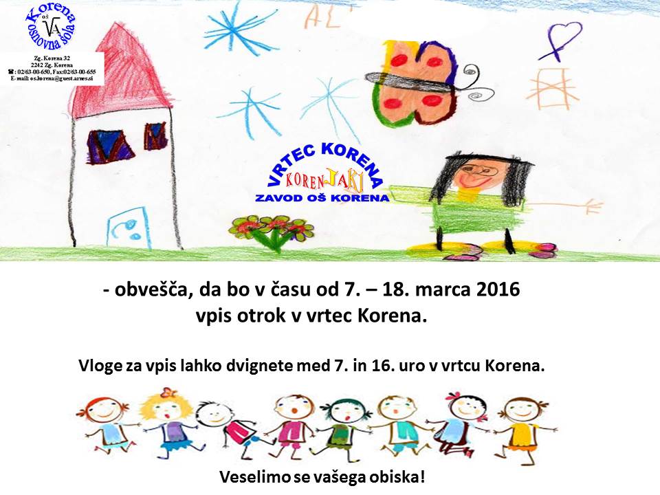 Osnovna šola Duplek in Osnovna šola Korena obveščata starše, da bo vpis otrok v enote vrtcev Sp. Duplek, Zgornji Duplek, Dvorjane in Korena potekal v času od 7.3.2016 do 18.3.2016 med 7. in 16. uro.