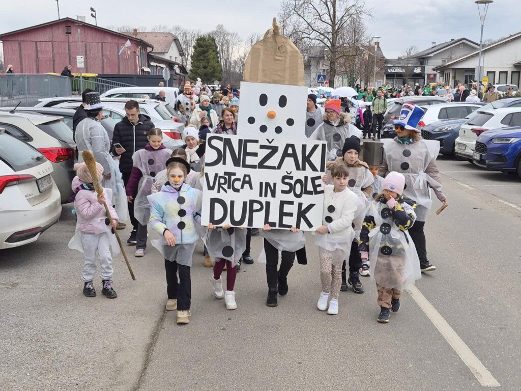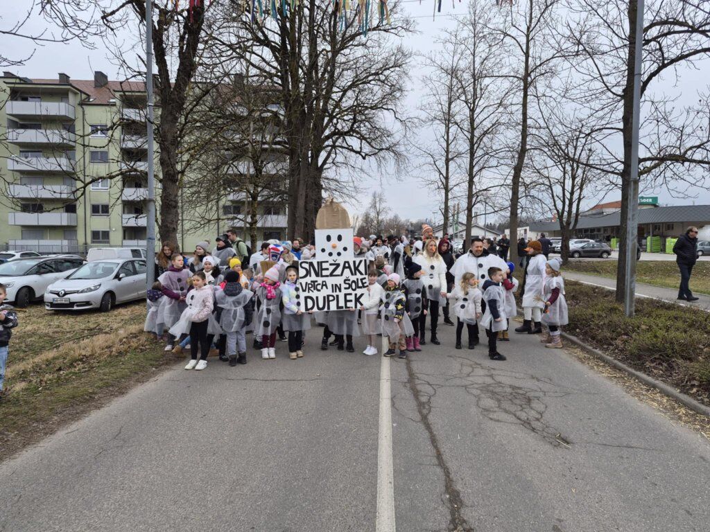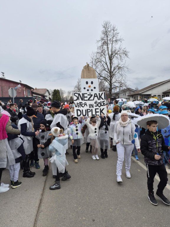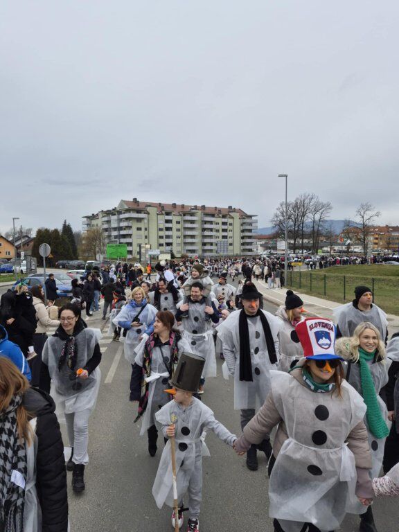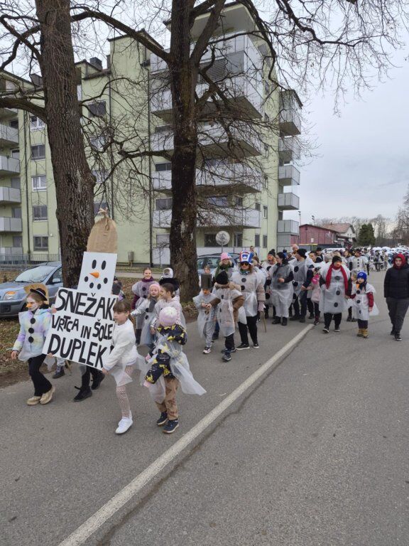 Letošnja skupna maska je bila SNEŽAKI. Bele kape, šali, korenčki, nasmejani obrazi in ustvarjalni dodatki so povorko spremenili v pravo zimsko pravljico. Otroci so z navdušenjem ponosno predstavljali svoje maske, starši pa so s sodelovanjem pokazali, kako pomembno je skupno ustvarjanje in ohranjanje tradicije.