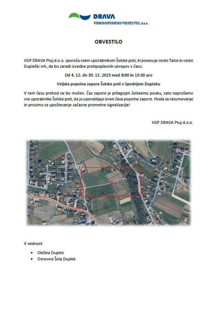 Obveščamo vas, da bo v času 4. 12. do 30. 12. 2023 med 8.00 in 13.30 uro, veljala popolna zapora Šolske poti v Sp. Dupleku, zaradi izvedbe protipoplavnih ukrepov.