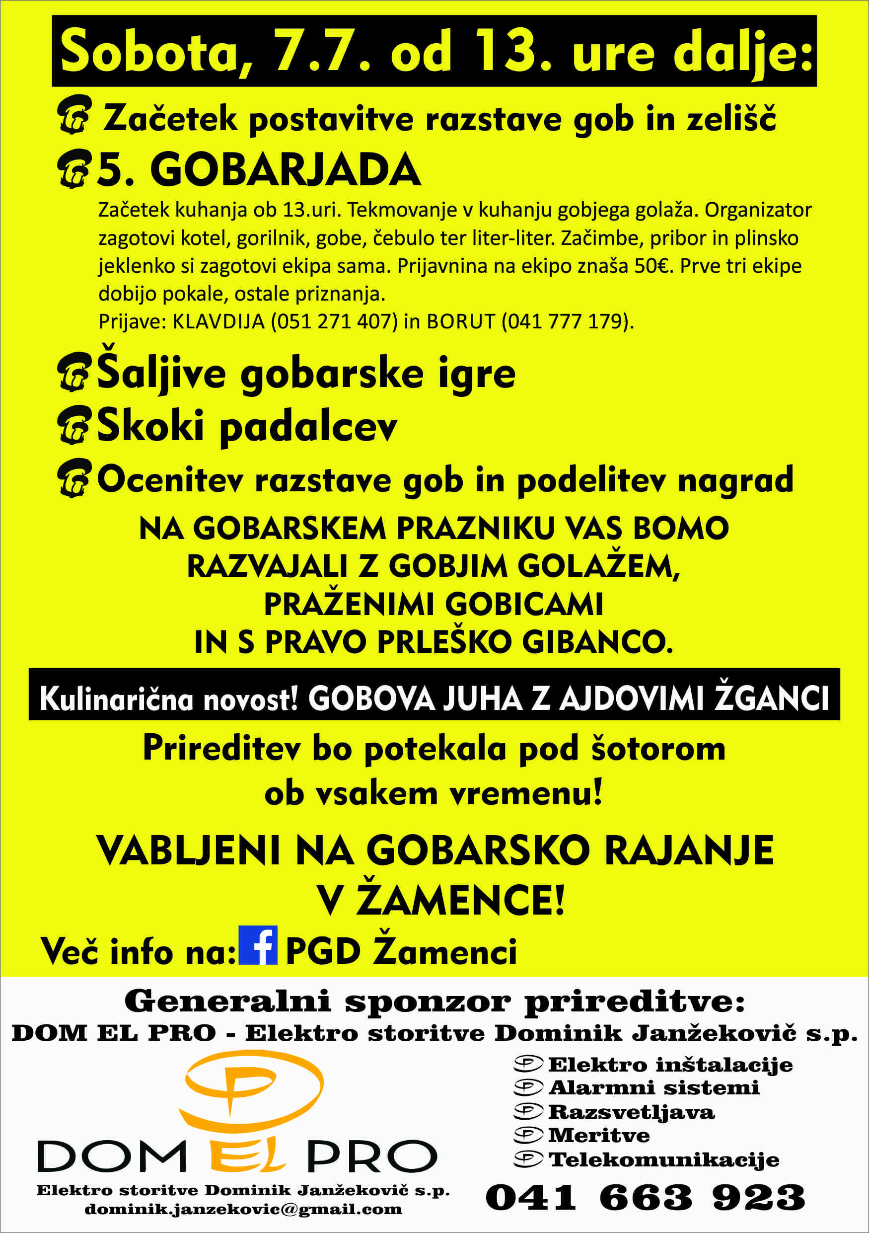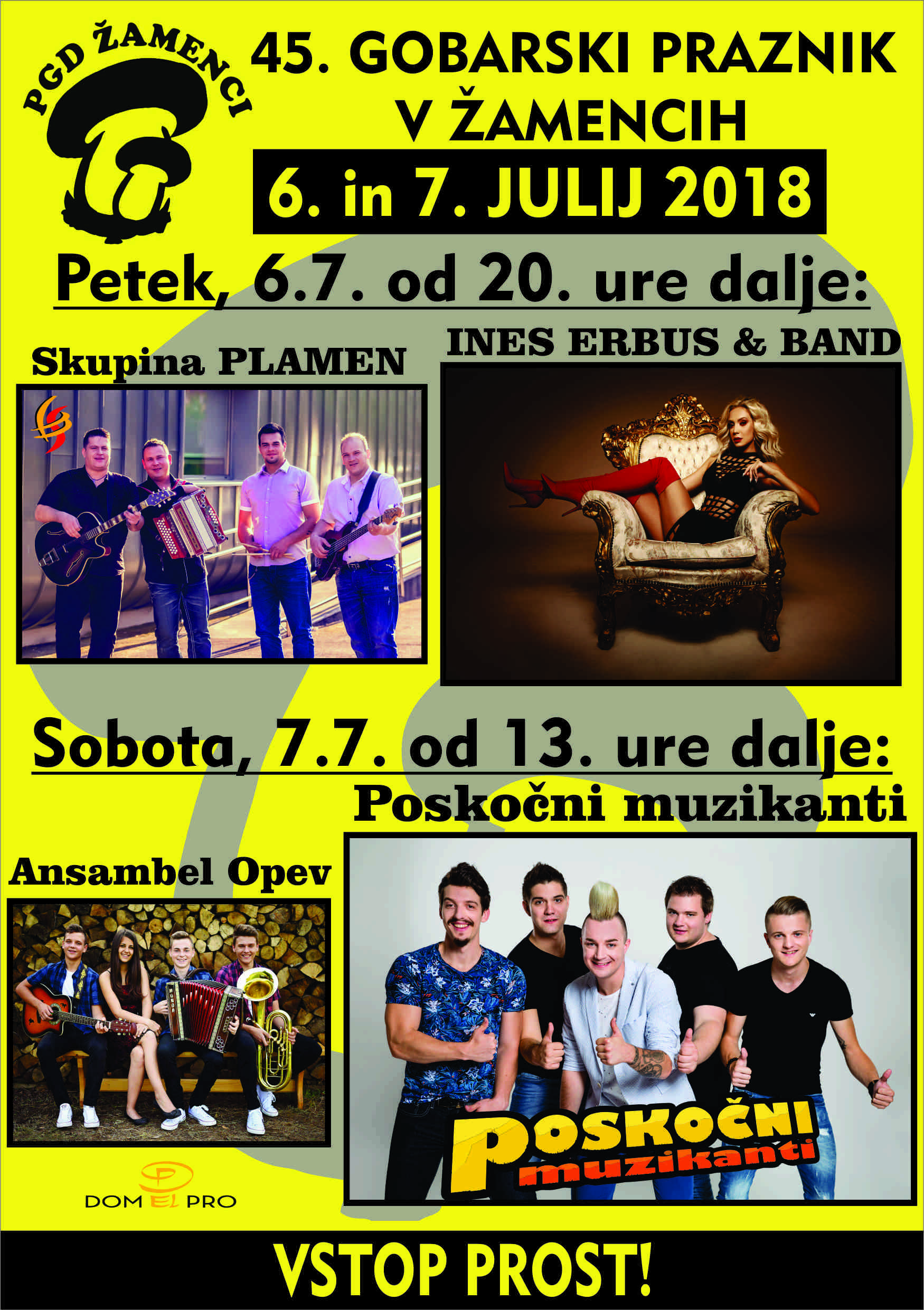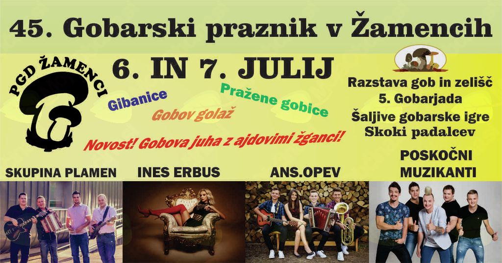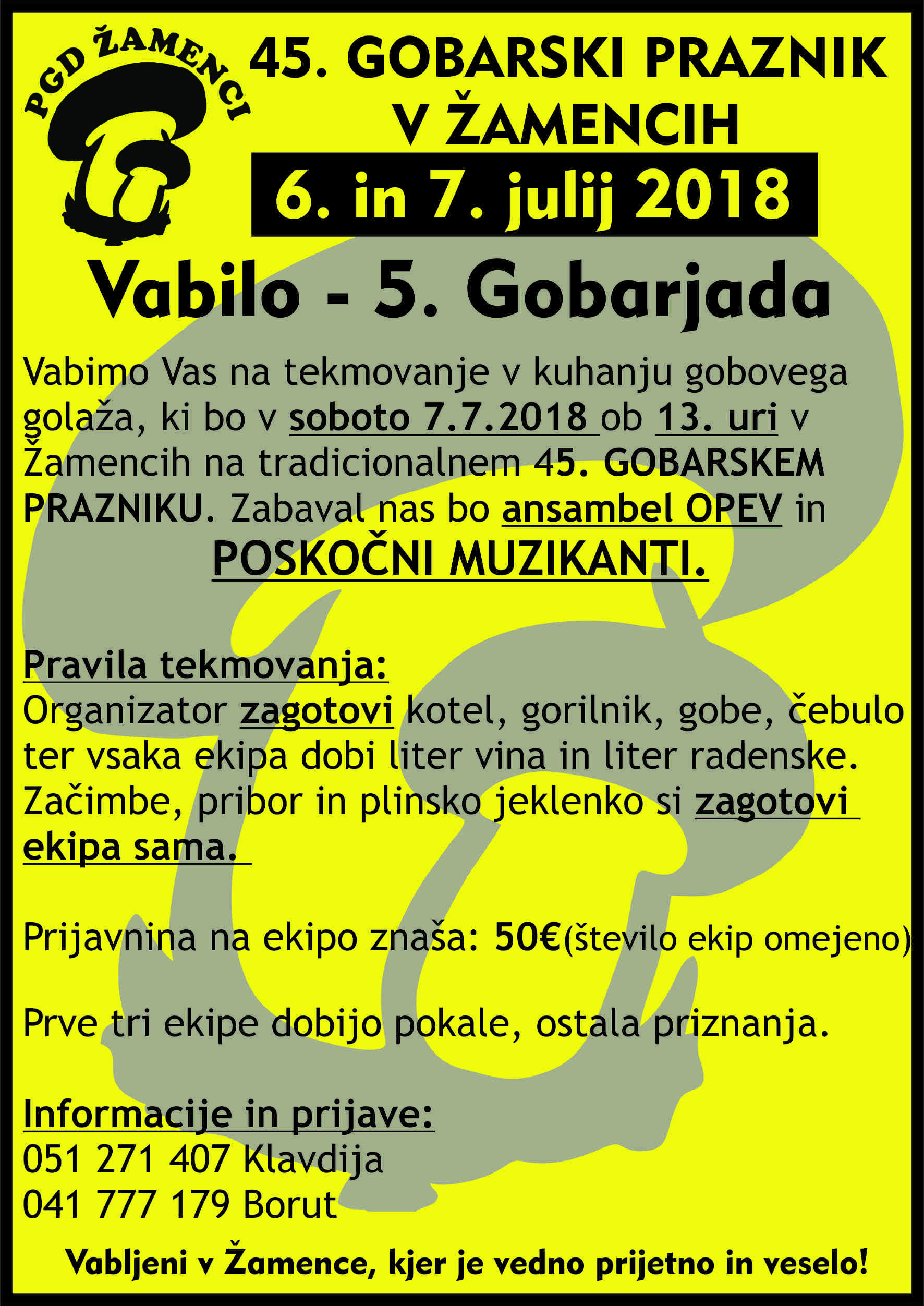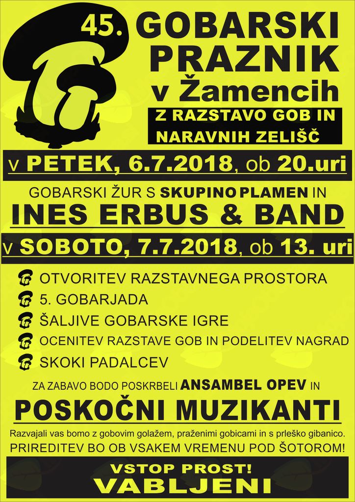 Vabljeni na 45. GOBARSKI PRAZNIK, ki bo v petek 6.7. in soboto 7.7.2018 na športnem igrišču v Žamencih