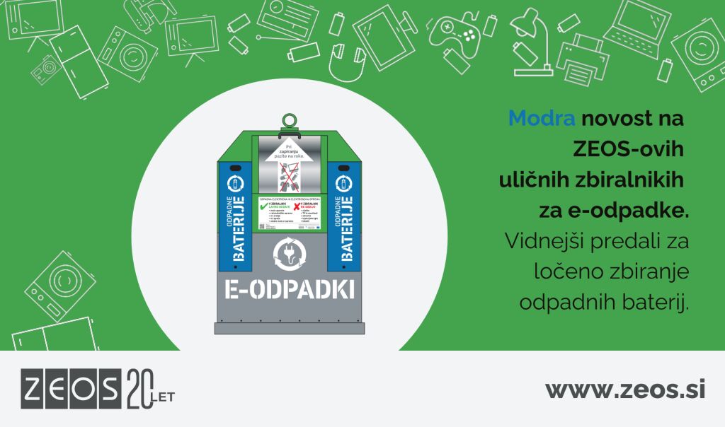 Družba ZEOS, d.o.o. na ulične zbiralnike za e-odpadke po državi pospešeno namešča male modre zbiralnike za odpadne prenosne baterije in akumulatorje. Tako gospodinjstvom omogoča še dostopnejšo mrežo ločenega zbiranja tovrstnih odpadkov ter zmanjšuje negativne vplive na okolje v primeru oddajanja baterij med mešane komunalne odpadke. Nepravilno odloženi e-odpadki predstavljajo nevarnost za okolje, surovine, ki se nahajajo v njih pa so za vedno izgubljene. Ustrezno ločene lahko recikliramo in maksimalno zmanjšamo negativen vpliv na okolje in zdravje ljudi. Preprečimo ali zmanjšamo lahko celo požarna tveganja, ki obstajajo v primeru nepravilne oddaje, predvsem odpadnih baterij. Z njihovo oddajo na primerna zbirna mesta poskrbimo, da se obdelajo na varen in okolju prijazen način, materiali pa ponovno stopijo v predelovalni krog. Družba ZEOS, d.o.o. ima v načrtu do konca leta na ta način prenoviti vse ulične zbiralnike za zbiranje starih aparatov po državi. Ulični zbiralniki so bili sicer postavljeni v sklopu projekta Life Gospodarjenje z e-odpadki že pred devetimi leti.