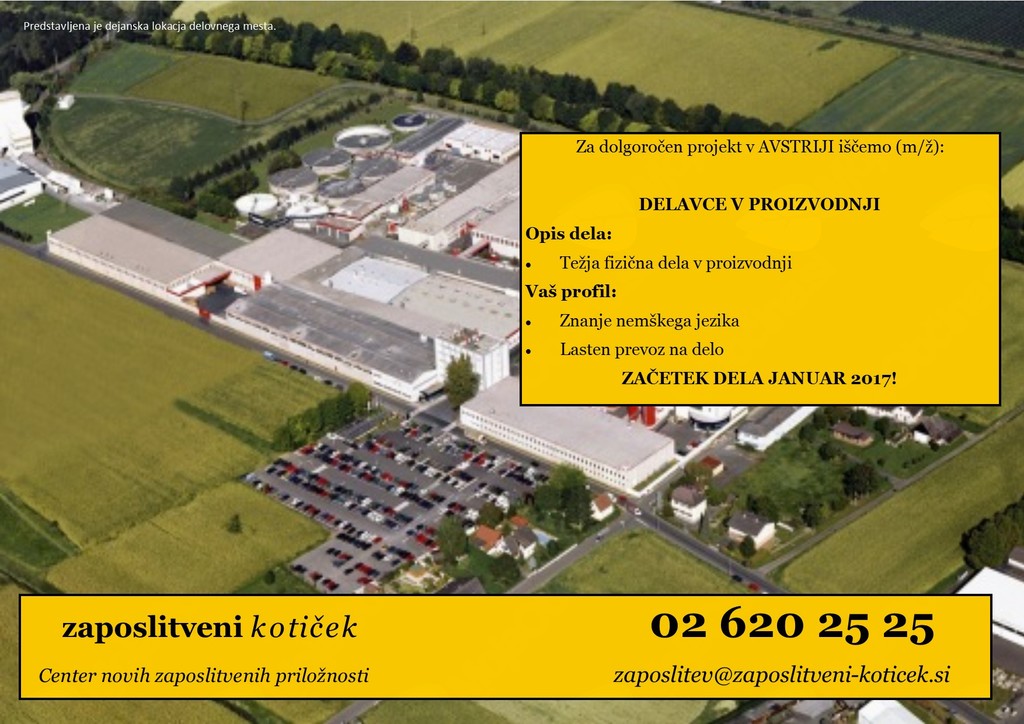Ponuja se priložnost takojšnje zaposlitve v Avstriji, le 60 km oddaljenosti od Murske Sobote, za težja fizična dela v proizvodnji. Pogoj za delo je osnovno znanje nemškega jezika in lasten prevoz na delo.