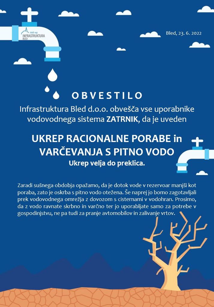 Infrastruktura Bled d.o.o. obvešča vse uporabnike vodovodnega sistema Zatrnik, da je uveden ukrep racionalne porabe in varčevanja s pitno vodo.