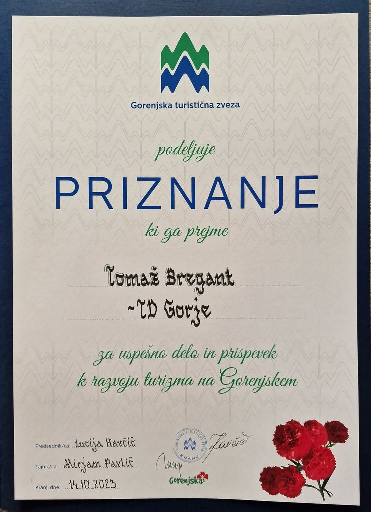 Priznanje je prejel tudi bivši strokovni vodja in pomemben član TD Gorje, Tomaž Bregant in sicer za prispevek k razvoju turizma v Gorjah, kar je, kot so zapisali v obrazložitvi postalo opazno tudi v širšem prostoru. Kot so še zapisali, je bil opažen tudi njegov prispevek ob nastajanju zbornika, ki ga je TD Gorje izdalo ob 130 letnem jubileju.