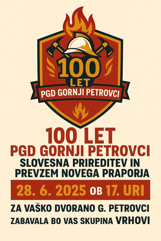 Prostovoljno gasilsko društvo Gornji Petrovcivas vabi na prireditev ob 100. obletnici delovanja in prevzem novega praporja, ki bo v soboto, 28. 6. 2025, ob 17. uri, za vaško dvorano v Gornjih Petrovcih.