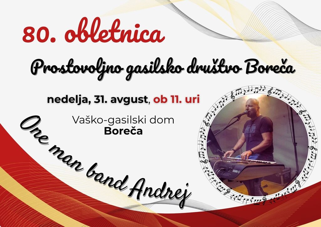Prostovoljno gasilsko društvo Boreča vas vabi na prireditev ob 80. obletnici delovanja, ki bo v nedeljo, 31. 8. 2025, ob 11. uri, pri vaško-gasilskem domu v Boreči. Po slavnostni prireditvi bo zabava z One man band Andrej.