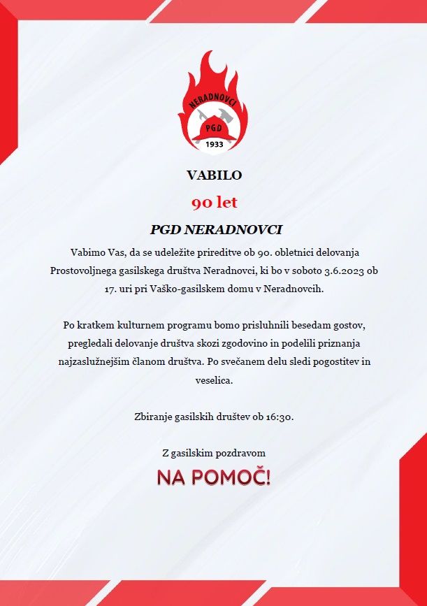 PGD Neradnovci vas vabi, da se udeležite prireditve ob 90. obletnici delovanja, ki bo v soboto, 3. 6. 2023, ob 17. uri, pri Vaško-gasilskem domu v Neradnovcih.