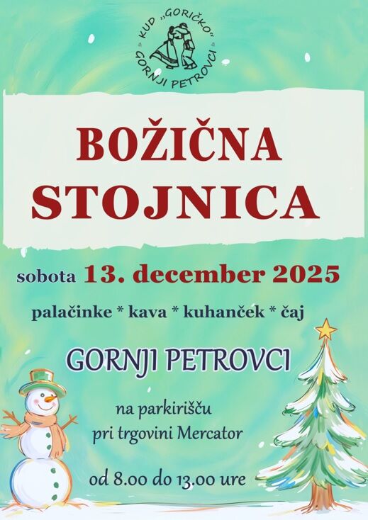 KUD Goričko Gornji Petrovci vas vabi na božično stojnico, ki bo v soboto, 13. 12. 2025, od 8. do 13. ure,