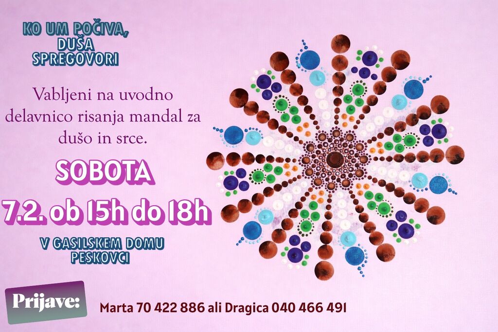 KTD Vesele vidre Peskovci vabi na sprostistveno delavnico risanja mandal, kjer si boste lahko vzeli čas zase, se umirili in skozi barve izrazili notranji mir.